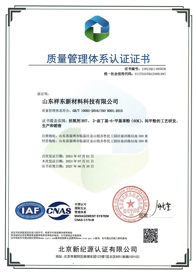 山東祥東新材料科技有限公司1.2萬噸/年6-叔丁基鄰甲(60K)、4-叔丁基鄰甲酚(偏 24 酚)和 4,6-二叔丁基鄰甲酚(偏 246 酚)烷基甲酚項目竣工環境保護驗收監測報告
